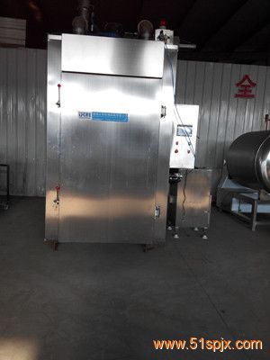 2、本机具有蒸汽加热(蒸煮)、烘烤干燥(热风)、烟熏、排气及清洗等功能。关键部件是由蒸汽管道、热交换器和出气管道组成完善的循环系 统,箱内熏烟与热气的混合气体在两组循环风机的作用下,形成涡流区域,使混合气体以适宜的速度平稳而均匀地通过悬挂在烟熏箱内的肉制品,使其熟化和灭菌。