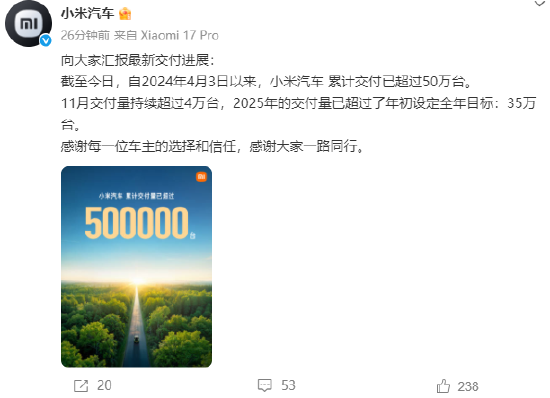 小米汽车:2025年累计交付超50万台,已提前完成今年35万台目标