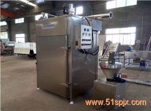 本设备由烟熏箱、自动程序控制器、烟雾发生器、烟熏车四部分组成。关键部件是由蒸汽管道、热交换器和出气通道组成完善的循环系统,箱内熏烟与热气的混合气体在两组循环风机的作用下,形成涡流区域,使混合气体以适宜的速度平衡而均匀地通过悬挂在烟熏箱内的肉制品,使其熟化和灭菌。