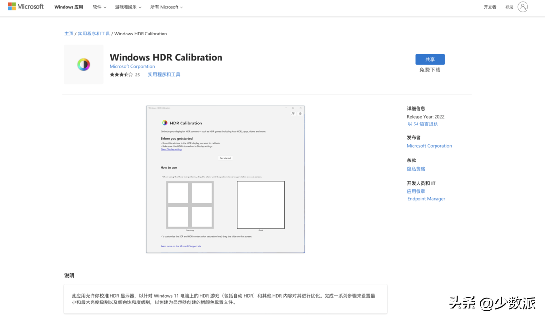 下载并安装该工具以(yi)后,需要首先进入「设置」-「系统」-「显示器」并打开其(qi)中的「HDR」开关(guan),如果你没找到「HDR」开关那么(me)就是你的显示器并不支持 HDR 模式。接着打开 Windows HDR Calibration 这个 app,选择(ze)「Get started」就可以开(kai)始校准过程了,整个矫正过程分(fen)为 4 个步骤: