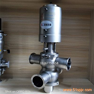 该型阀门具有两个独立的阀芯密封件,在正常工 作状态时这两个密封件之间就会形成一个与大气相遇的泄漏腔. 在偶尔可能出现的事故或产品泄漏的情况下, 产品就会流进这个泄漏腔,并且从排出口被排放出去,不会造成产品的污染或混料;当阀门处于开启状态时,该露腔是闭合的,在阀门正常运行过程中,并不存在产品溢出的情况. 因此所输送的产品就能够从一条管线流到另一条去. 读型阀门可以进行CIP清洗.